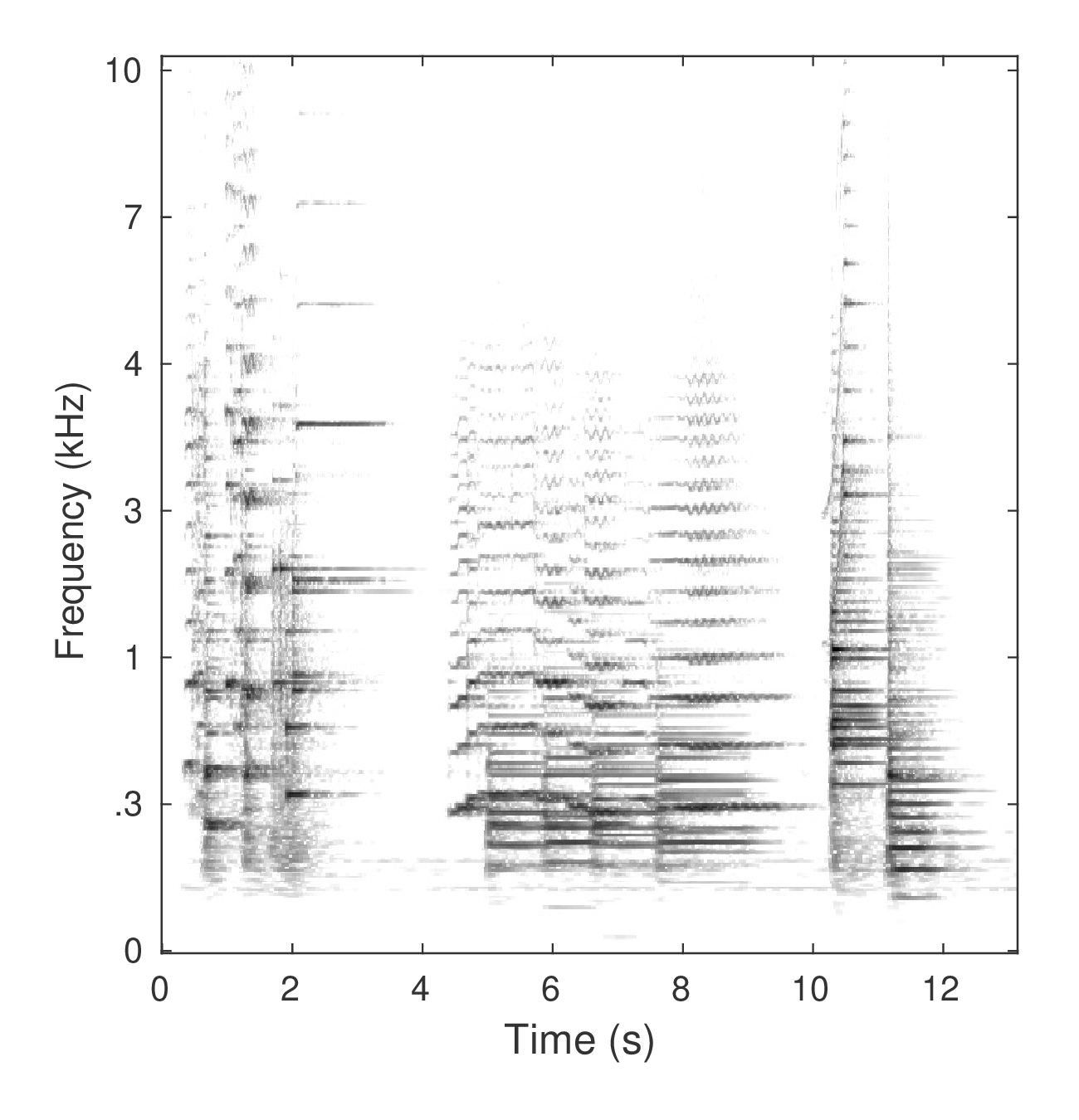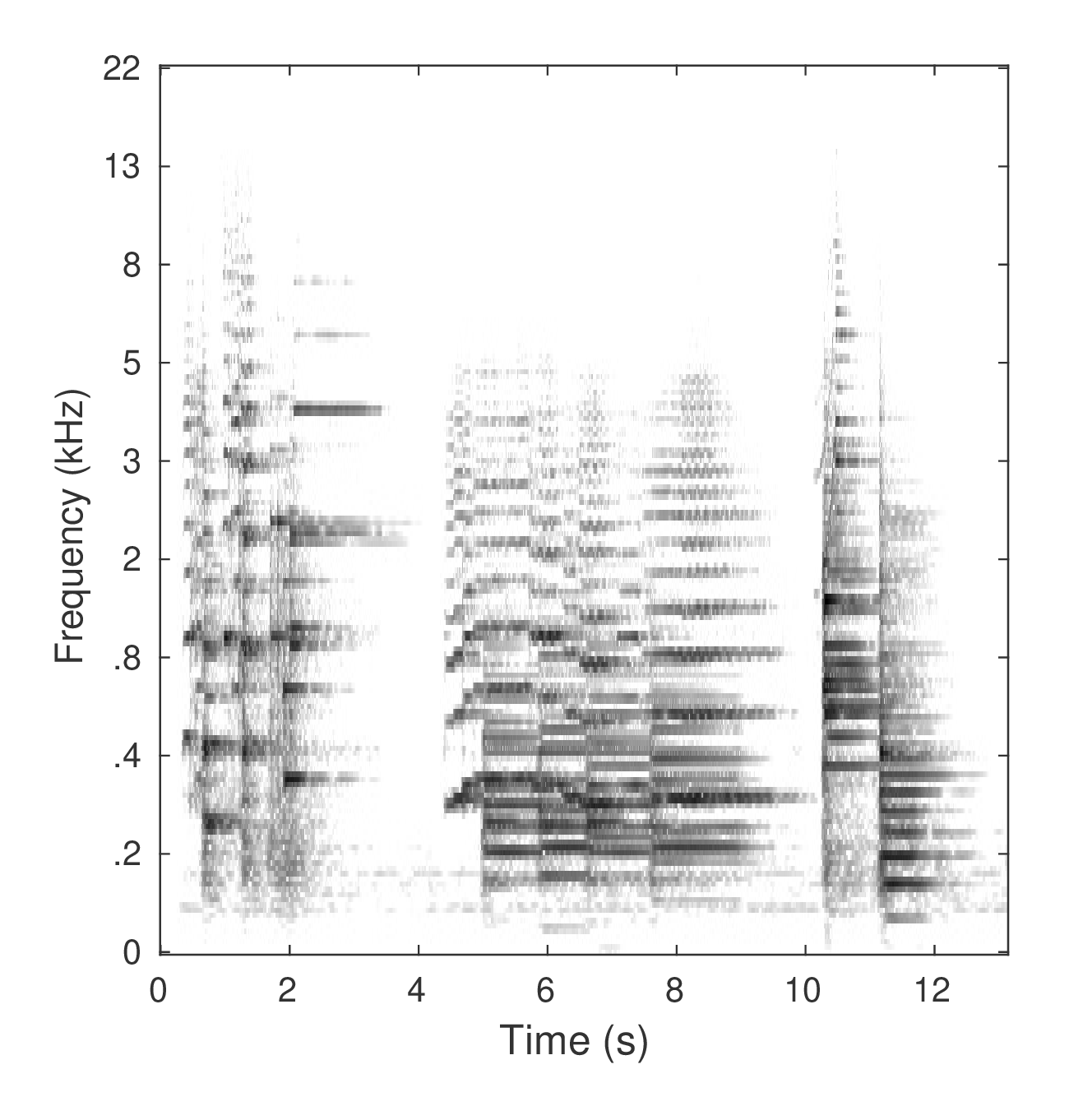 (b) Time-frequency plots of a short piano and violin excerpt. Color indicates intensity is in dB, the colorbar is valid for all plots.